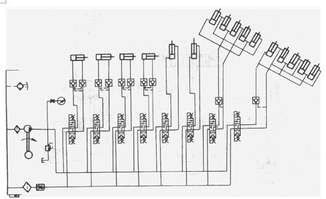個主缸垂直支撐著整體模板,為了使主缸能在任意位置停止并防止其由于自重自行下落,在四個主缸的進回油路上串接液控單向閥(液壓鎖)。主缸的控制閥選用“Y”型中位機能的控制閥,中位時,A.B兩油直接通油箱,液控單向閥立即關閉,活塞停止運動,實現了主缸的可靠定位。